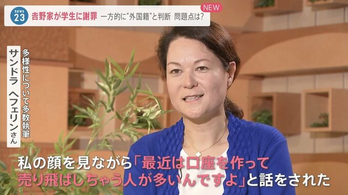 多様性に関する執筆を多く行っていて、ドイツにもルーツを持つコラムニストのサンドラさんです。数年前に、信用金庫で口座を作ろうとした時のこと・・・サンドラ ヘフェリンさん: