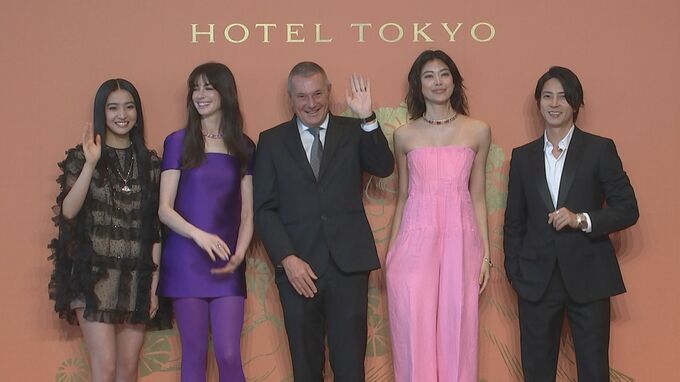 映画「プラダを着た悪魔」「オーシャンズ8」などで知られるハリウッド女優のアン・ハサウェイさんが、11年ぶりに来日。イタリアのハイブランド「BVLGARI」のアンバサダーとして「ブルガリ ホテル 東京」記者発表会に出席しました。アン・ハサウェイさんは、鮮やかな紫色のミニワンピースに紫色のタイツを合わせたスタイルで登場。