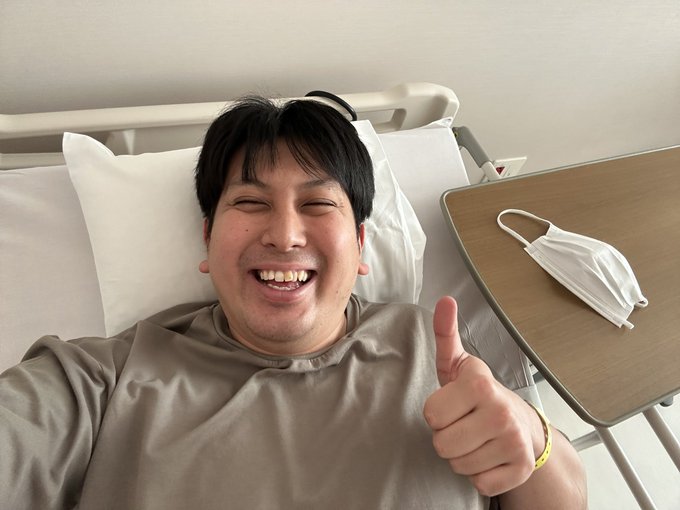 病院のベッドに横たわる写真と共に「めっちゃ無事扁桃腺取れました!」と扁桃腺の手術を行ったことを報告しました。