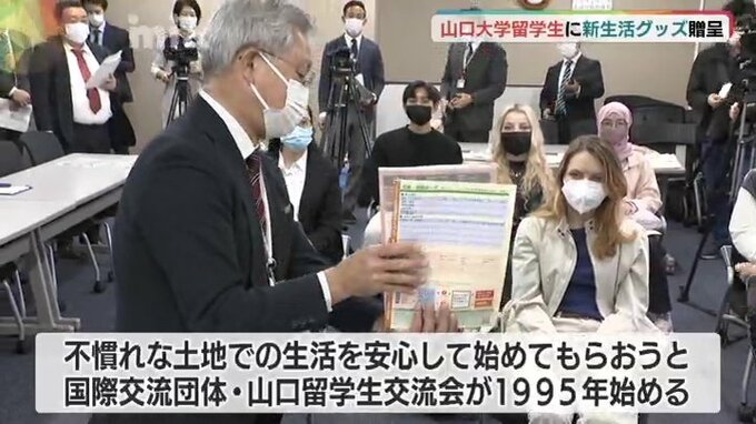 新生活を始める留学生を応援しようと、山口市の国際交流団体が4日、山口大学の留学生に暮らしに役立つ品を贈りました。
