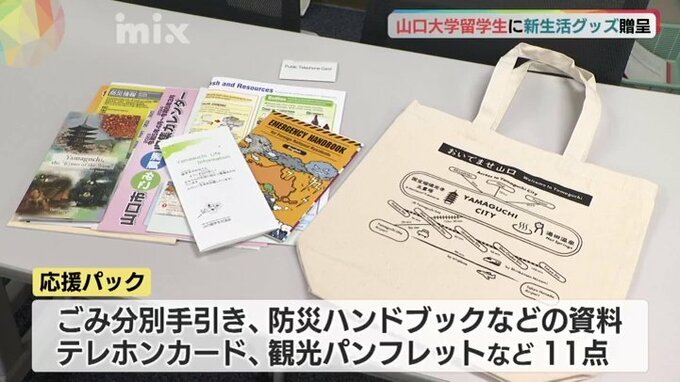 山口大学に入学した留学生107人に、「新生活応援パック」が贈られました。不慣れな土地での生活を安心して始めてもらおうと、国際交流団体・山口留学生交流会が1995年から始めた取り組みです。応援パックには、ごみ分別の手引きや防災ハンドブックなど生活に役立つ資料のほか、テレホンカードや観光パンフレットなど11点が入っています。