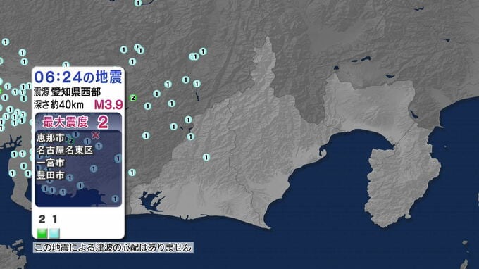 【地震速報】 浜松天竜区で震度1を観測 愛知県西部で震度2の地震 津波の心配なし 静岡放送 2023年4月5日(水) 07:03 国内 6時24分頃、地震がありました。この地震による津波の心配はありません。震源は愛知県西部 深さは約40km規模はM3.9 最大震度は2 県内の震度図 震度1 浜松天竜区