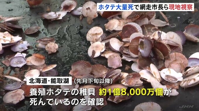 北海道網走市の湖で1億8000万個の養殖ホタテの稚貝が大量死したことを受け、市などがきょう、現地を視察しました。網走市の能取湖では午前9時すぎ、水谷洋一市長や漁協の関係者らが現地で養殖かごを引き揚げ、状況…