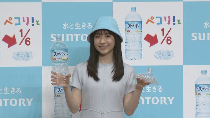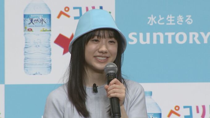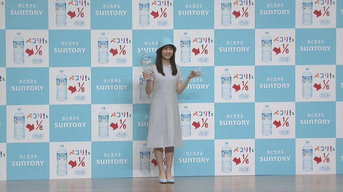俳優の芦田愛菜さんが「サントリー天然水」2L新容器・新CM記者発表会に出席しました。新CM(4月17日から放送開始)には布袋寅泰さんも出演しています。この日の芦田さんは、ペットボトルのキャップをイメージした帽子と水色のワンピースという、全身『天然水』をイメージした衣装で登場。