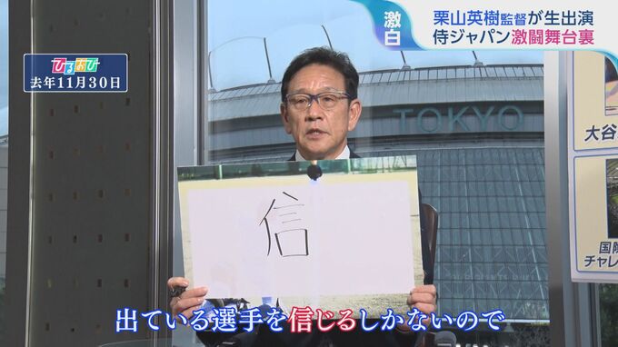 去年11月のインタビューで、栗山監督は「僕が一瞬たりとも大丈夫かなって試合中に思ったら負けるから、信じ切っていきます。」そう話し、『信』という字を書いてくれました。