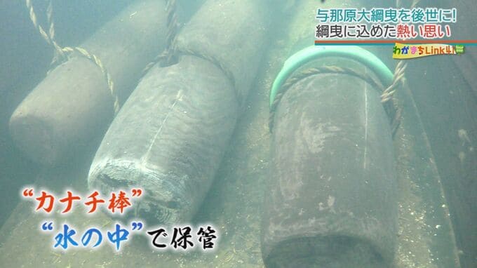 年に1度、祭り本番の時だけ取り出される『カナチ棒』。長さ3.2メートル、重さ70キロ、樹齢120年の栗の木でできた5年目のものと、重さ65キロ、ゆし木でできた樹齢70年目の大木です。乾燥に弱いため、地域の人たちによって、水の中で大事に保管されています。