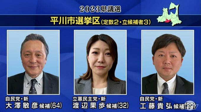 シリーズでお伝えしている県議会議員選挙の注目の選挙区、5日は平川市選挙区です。定数2に対して立候補しているのは、届け出順に自民党の大澤敏彦候補(64)、立憲民主党の渡辺果歩候補(32)、自民党の工藤貴弘候補(39)の3人で、いずれも新人です。