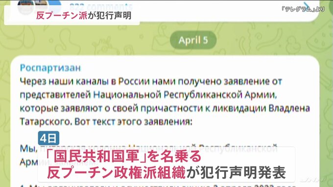 ロシアのサンクトペテルブルクのカフェで爆発が起き、ウクライナ侵攻を支持していた軍事ブロガーが死亡した事件で、反プーチン政権派の組織が犯行声明を出しました。2日、サンクトペテルブルクのカフェで起きた爆…