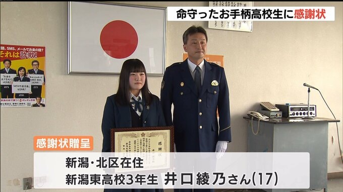 新潟北署から感謝状を贈られたのは、新潟市北区に住む新潟東高校3年生・井口綾乃さん(17歳)です。