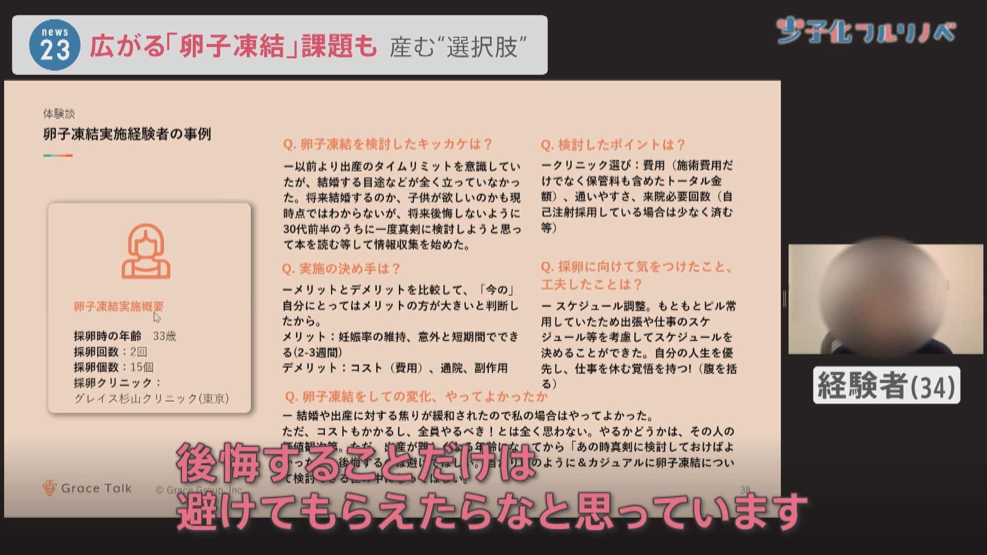 「久しぶりに一人暮らしになって、これからどうしようかなと、ちょっと立ち止まったというか。(妊娠・出産について)一生懸命答えを出そうとしても、その間に時間が経つと、なんかどんどん猶予がなくなっていくような、そんな焦りもあったので。卵子凍結をしたら、考える時間が少し延びるのかなって」