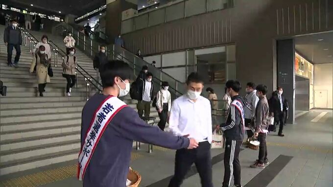 午前7時半から行われた街頭啓発では、岡山県選挙管理委員会の職員らが投票日が書かれたポケットティッシュなどを配って投票を呼びかけました。
