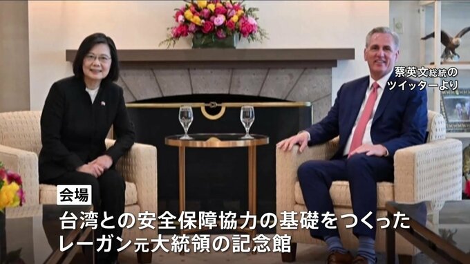 台湾の蔡英文総統が日本時間のきょう未明、アメリカのマッカーシー下院議長と会談し、経済と安全保障の両面で連携強化を確認しました。記者「各国のメディアが集まる中行われた会談は、台湾とアメリカの関係が強固…