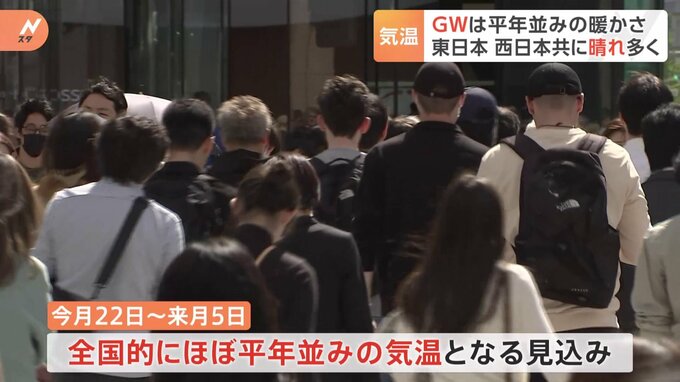 ゴールデンウィークは全国的にほぼ平年並みの暖かさとなりそうです。気象庁は、8日から来月7日までの1か月の天候の見通しを発表しました。それによりますと、8日からの1週間は北日本と東日本で平年より気温が高く…
