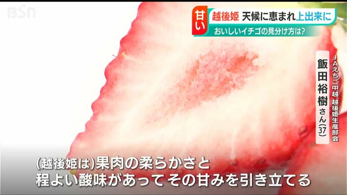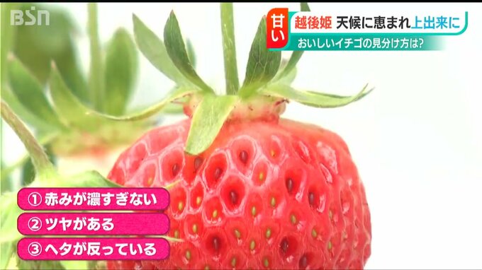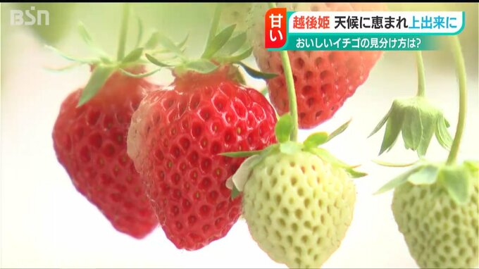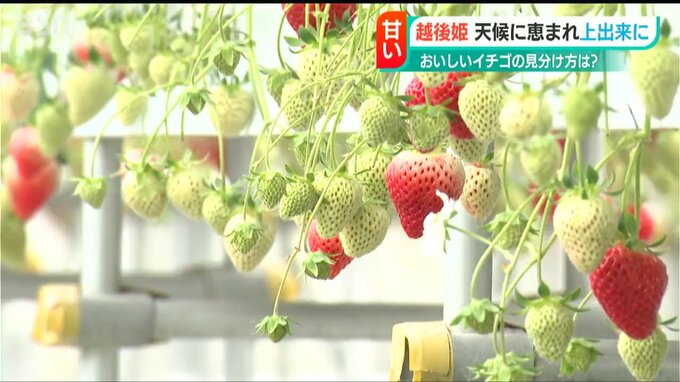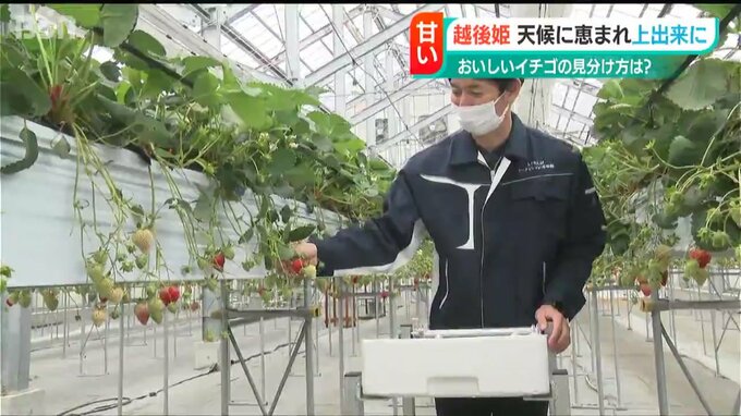 ツヤツヤで大きく実った真っ赤な果実…新潟が誇るブランドイチゴ「越後姫」です。刈羽村で出荷のピークを迎え、生産者が一粒ずつ丁寧に摘み取っていました。