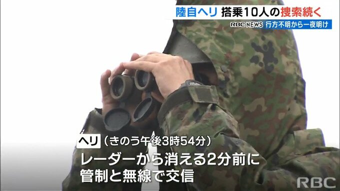 自衛隊や海上保安本部による捜索は、夜を徹して行われ現在も続いていますが、ヘリの機体や乗っていた隊員10人は発見されていません。