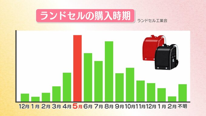 ランドセルの最近の傾向をまとめてみました。こちらは、去年の新入生のランドセルに関するデータです。まず、購入時期は5月が最も多くなっています。およそ1年前から準備するんですね。