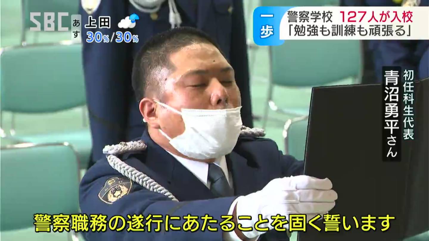 入校式には警察官と警察職員の初任科生127人が臨み、代表して青沼勇平(あおぬま・ゆうへい)さんが誓いの言葉を述べました。
