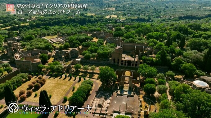 ローマ郊外の街ティヴォリにある、古代ローマのハドリアヌス帝の別荘跡です。こちらも空撮向きの世界遺産で、上空から見ると東京ドーム25個分の広大な敷地に、競技場や大浴場、図書館などが建ち並んでいたのがよく分かります。