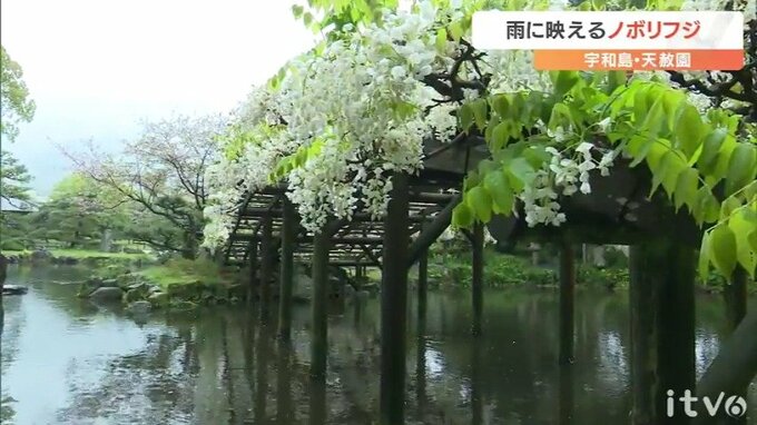 愛媛県宇和島市の日本庭園「天赦園」では、名物のノボリフジが見ごろを迎えていて、雨に映える白い花が訪れた人を楽しませています。国の名勝に指定されている宇和島市の天赦園では、池にかかる長さ24メート…
