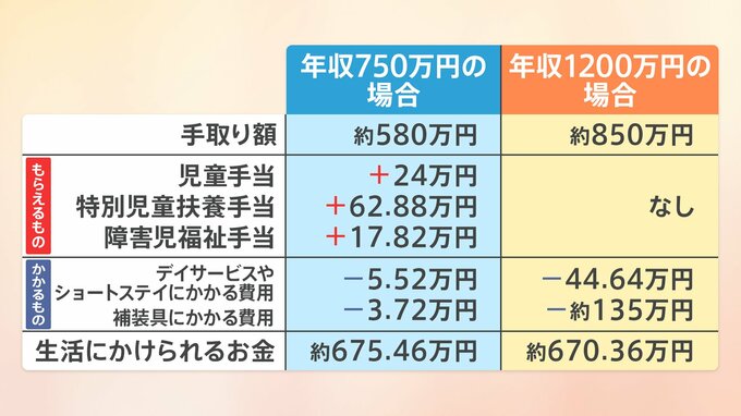 重度心身障害の子どもがいる家庭(母親は専業主婦、ほかに健常児の子供がいる4人家族、子どもは3歳以上中学生以下)を例に「生活にかけられるお金」を計算してみた。