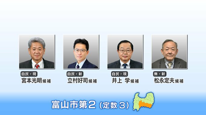 政党別にみると自民3人、無所属1人。保守色が強いこの選挙区で自民議席独占なるか。