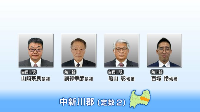 現職に新人が挑む形となった中新川郡選挙区。定数2に対して4人が立候補。