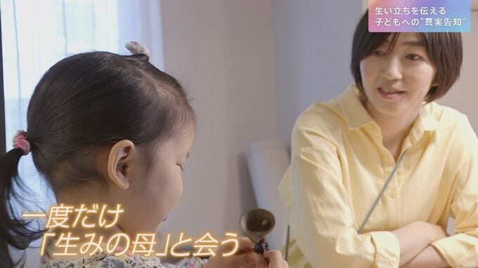 久保田さんは時々こんなふうに生みの母の話をしています。子どもに生い立ちを伝えることは「真実告知」と呼ばれています。成長してから、突然養子縁組されたと知ると、ショックを受けてしまう場合もあるため、幼いうちから生みの親の存在を知っておくことが望ましいとされています。