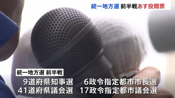統一地方選のうち、前半戦の知事選や政令市長選などはあすが投開票で、各陣営が最後の訴えを行っています。あす投開票が行われるのは、北海道や神奈川、大阪など9つの知事選や、札幌や静岡など6つの政令市長選です…