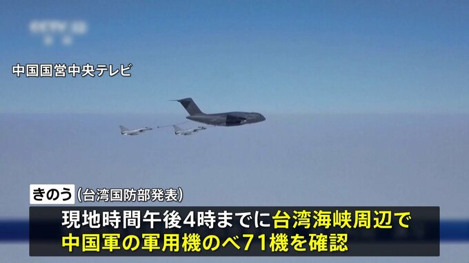 台湾を取り囲む形で軍事演習を始めた中国軍について、台湾国防部は、8日、台湾周辺で中国軍機のべ71機を確認したと発表しました。中国軍は8日から10日までの日程で、台湾周辺で軍事演習を始めたと発表しました。台…