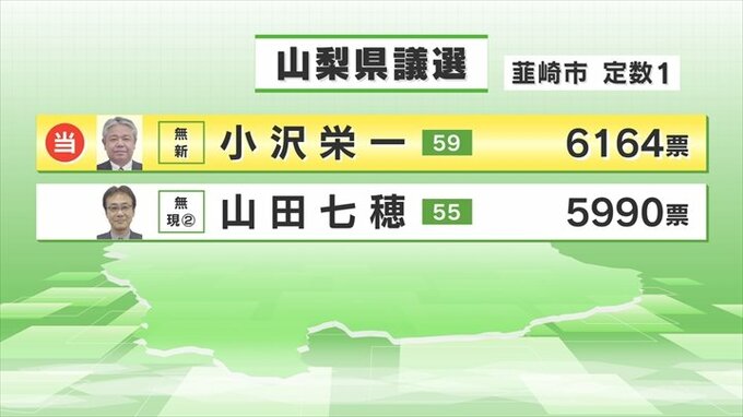 統一地方選挙2023 山梨県議会議員選挙 韮崎市選挙区(定数1)開票の結果 テレビ山梨 2023年4月9日(日) 23:00 国内 山梨県議会議員選挙 韮崎市選挙区(定数1) 無所属の新人 小沢栄一さんが当選