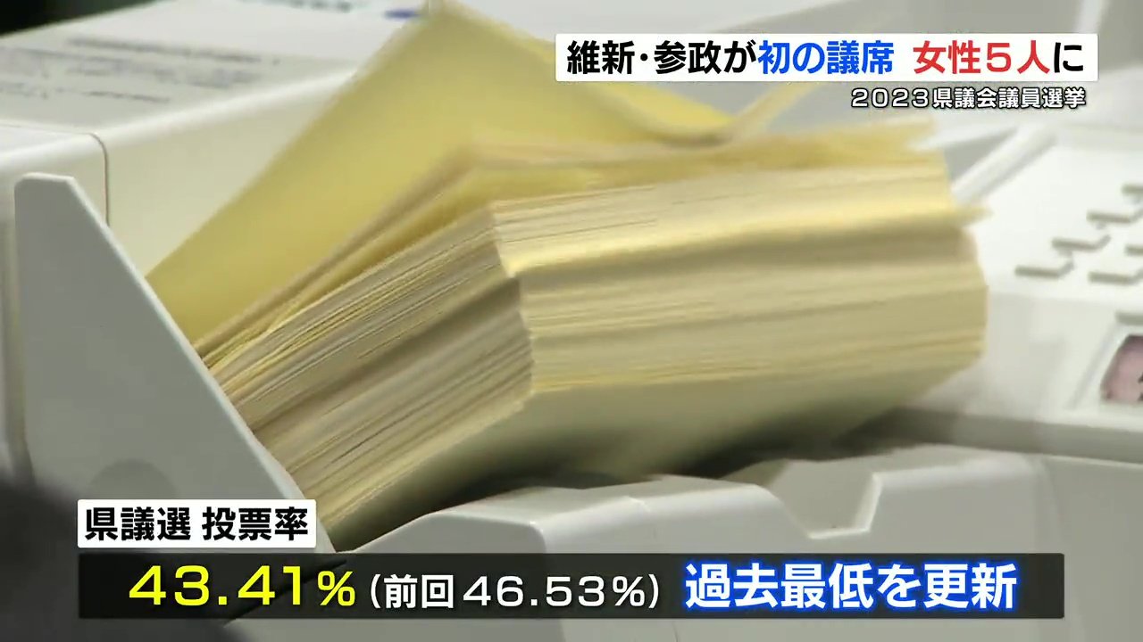 今回の県議選の投票率は43.41パーセントで、前回を3.12ポイント下回り過去最低を更新しています。