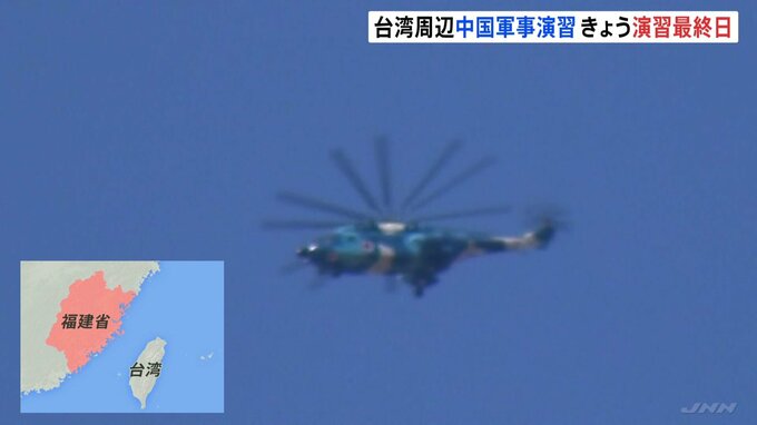 台湾周辺で8日に始まった中国軍の軍事演習は、最終日のきょうも行われているとみられます。記者「中国軍のヘリコプターでしょうか。台湾海峡の方に向かって飛んでいきます」けさ、JNNのカメラがとらえた台湾方面に…