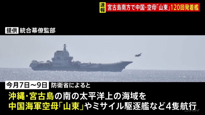防衛省は、中国の空母「山東」が沖縄県の宮古島の南の海域を航行し、戦闘機などがおよそ120回、発艦や着艦を繰り返したと発表しました。防衛省によりますと、今月7日から9日にかけて、宮古島の南、太平洋上の海域…