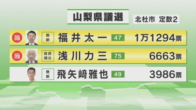 福井太一さんが1万1000票余りでトップ当選、自民党県連ナンバー2の浅川力三さんは今期最多6期目の当選です。