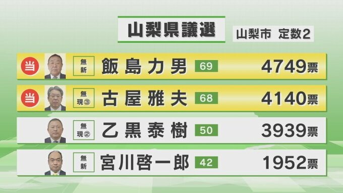 新人の飯島力男さんと現職の古屋雅夫さんが当選し、知事選で長崎知事の対立候補を支援した現職の乙黒泰樹さんは涙をのみました。