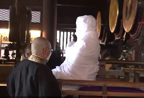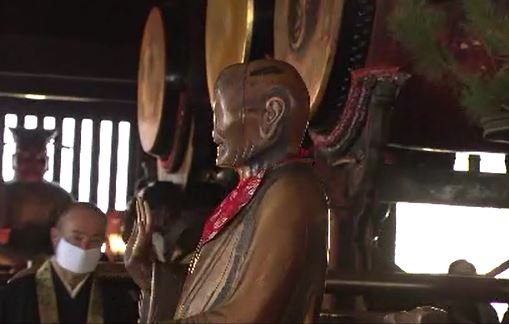 (井上怜記者)「いま、びんずる尊者像が本堂に運び込まれました。元の位置に再び安置されます」