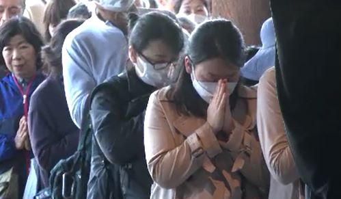 (井上記者)「びんずる尊者像の帰りを待ちわびていた参拝客が、次々にその肩や顔、手などに触れています」