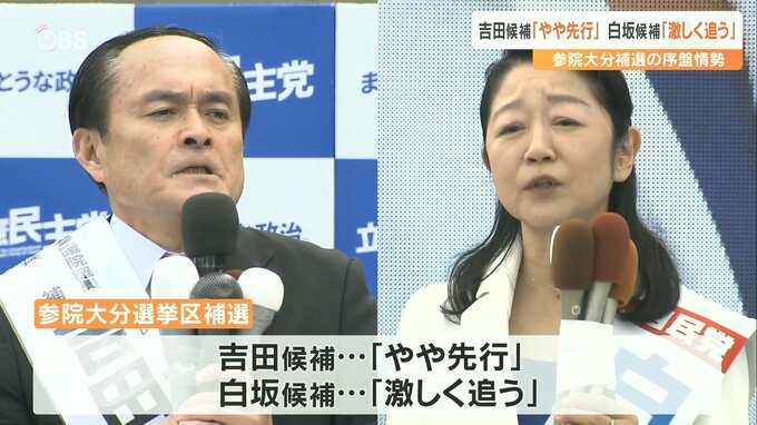 OBSは8日と9日、大分合同新聞社、JX通信社と共同で参議院大分選挙区補欠選挙の世論調査を実施しました。調査結果にOBSの取材を加味した序盤の情勢は吉田さんがやや先行し、白坂さんが激しく追う展開となっています…