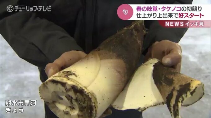 富山県内有数のタケノコの産地、射水市黒河地区では旬の味覚、香り高いタケノコの初競りが行われました。初日の10日は、朝どれのタケノコおよそ500キロが出荷され、1キロあたり150円から350円で競り落とされました…