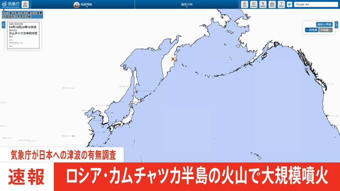 ロシアのカムチャツカ半島にある火山で、日本時間の10日夜大規模な噴火が発生したとして、気象庁は10日午後11時過ぎ、この噴火に伴う日本への津波の影響があるかどうか調査中であると発表しました。気象庁によりま…