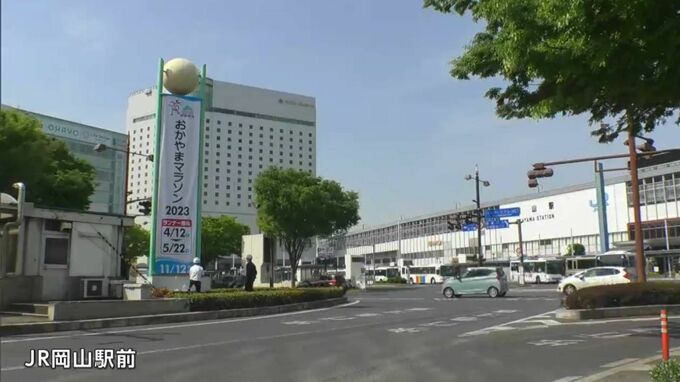 おかやまマラソンのランナーの募集があす(12日)から始まるのを前に、JR岡山駅前に懸垂幕が掲げられました。