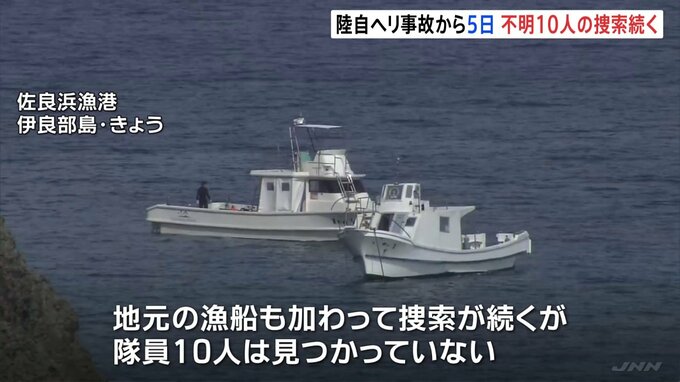 陸上自衛隊のヘリコプターが沖縄県の宮古島周辺で消息を絶ってから5日、地元の漁船も加わって捜索が続けられていますが、ヘリに乗っていた隊員10人は見つかっていません。自衛隊では艦艇3隻、航空機6機、隊員290人…