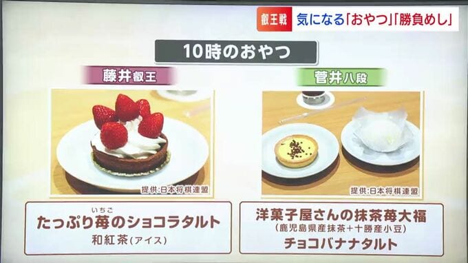 まず10時のおやつ藤井叡王が「たっぷり苺のショコラタルト」に対し、菅井八段は「洋菓子屋さんの抹茶の苺大福」と「チョコバナナタルト」と2品。