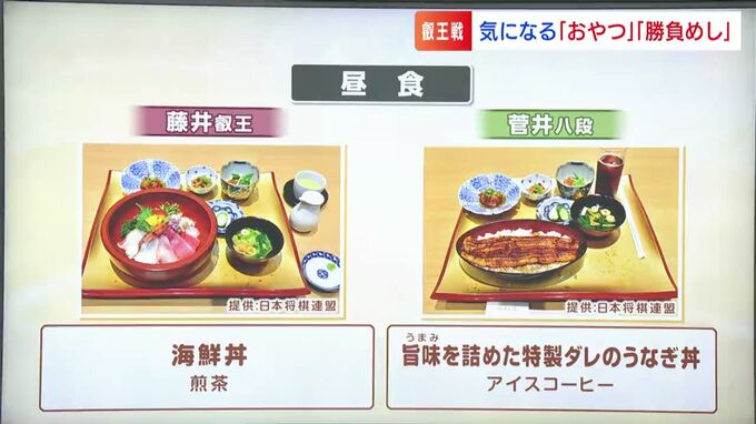 そして勝負めしの昼食は、藤井叡王「海鮮丼」に対し、菅井八段が「旨味を詰めた特製ダレのうなぎ丼」でした。