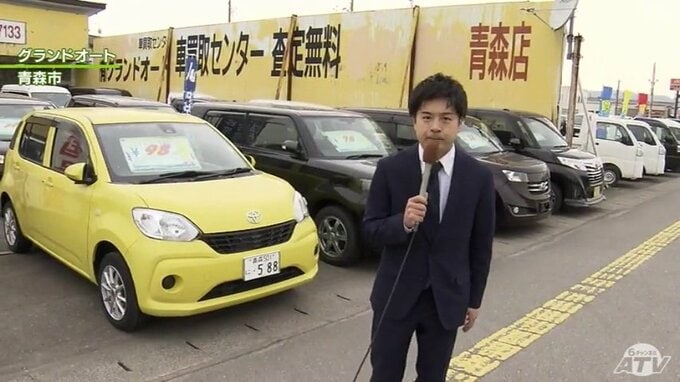 ※河村庸市キャスター「青森市にある中古車販売店です。こちらで売られている車も黄砂の影響を受けるかもしれません」