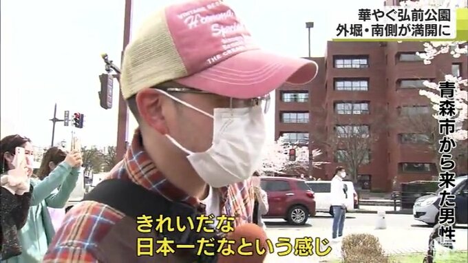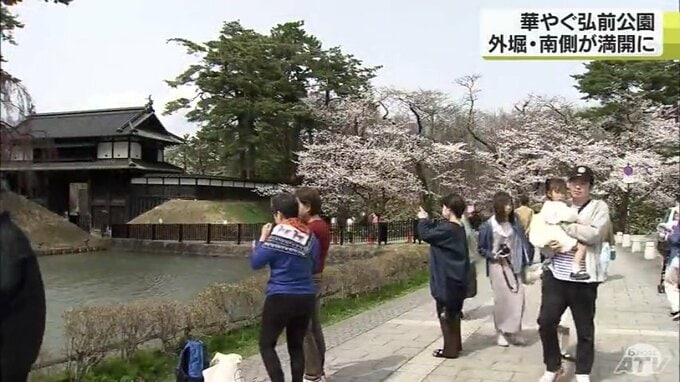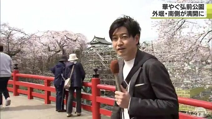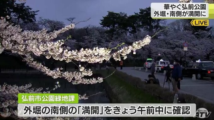 私がいます外堀南側は日当たりが非常に良い場所でして、東側北側は見頃となっているんですが、弘前市公園緑地課によりますと南側のソメイヨシノは、今日午前中に満開になったことが確認されたということなんですね。