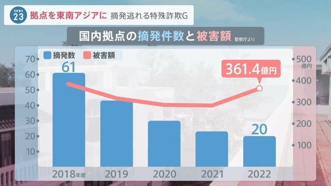警察庁によると、特殊詐欺の国内拠点の摘発件数はこの5年で61件から20件に減少するなど、拠点の海外シフトが伺えます。一方で被害額は2022年、増加に転じている状況です。