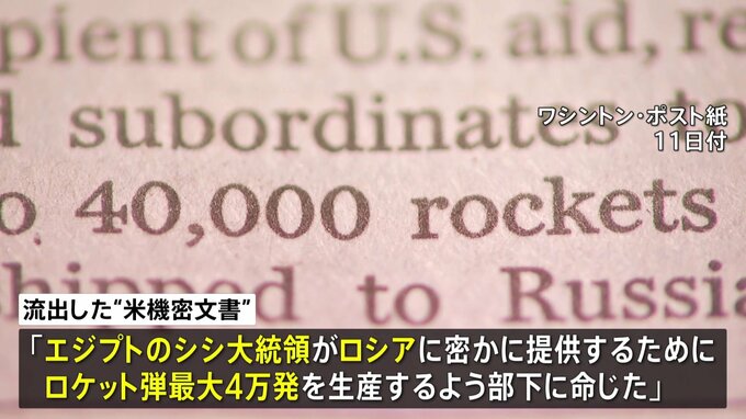 SNS上に流出したアメリカの機密情報とされる文書の中に、エジプトがロシアに対して密かにロケット弾などを提供しようとする動きが記載されていたことがわかりました。アメリカのワシントン・ポスト紙は11日、SNS上…