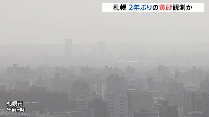 きょうからあすにかけて日本の広い範囲で黄砂の飛来が予測されています。きょう午前の札幌市の様子です。黄砂の影響か、あたりは白くもやがかかり、遠くにみえる札幌ドームもかすんでいます。黒い車のボンネットに…