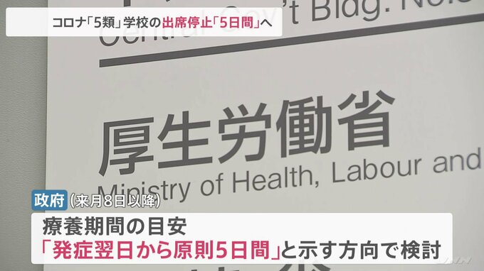 新型コロナの分類が「5類」に変更された後の療養期間について、政府が「発症の翌日から原則5日間」を目安として示す方向で検討していることがわかりました。コロナに感染した人は現在、症状がある人は原則7日間自…
